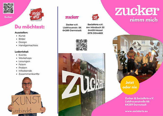 Wir sind für euch da und helfen euch, eure Ideen im "zucker" zu verwirklichen. Einen Kunstraum in Darmstadt für Jederfrau(mann) anzubieten, ist uns eine Herzensangelegenheit!